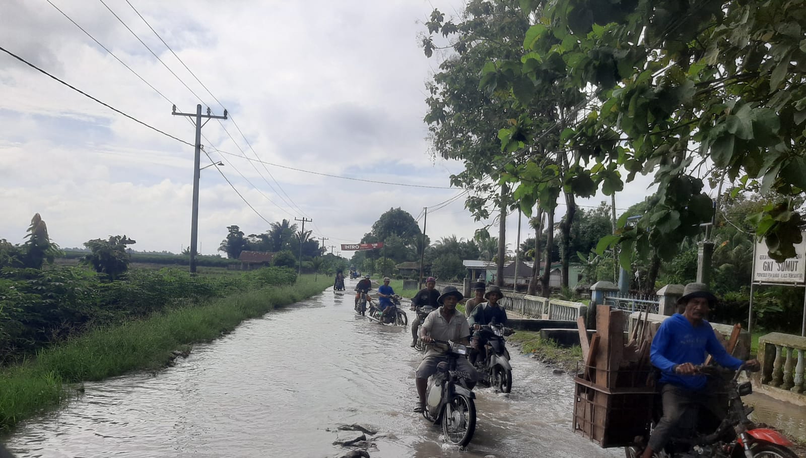 “Jalan ini jadi langganan banjir, karena parit yang ada dikiri kanan jalan ini tidak berfungsi baik, sehingga sedikit saja hujan agak deras turun, kondisi jalan langsung banjir,” ucap warga setempat.