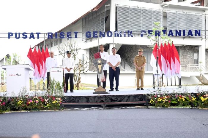 DOLOKSANGGUL (Waspada): Presiden RI Joko Widodo didampingi Menko Marves Luhut Binsar Pandjaitan, Menteri Perhubungan Budi Karya Sumadi, Kepala BSSN Hinsa Siburian dan Pj Gubsu Agus Fatoni resmikan Pusat Riset Genomik Pertanian yang berada di Taman Sains Teknologi Herbal dan Hortikultura (TSTH2) Kecamatan Pollung Kabupaten Humbang Hasundutan (Humbahas) Sumatera Uatara, Rabu (16/10).