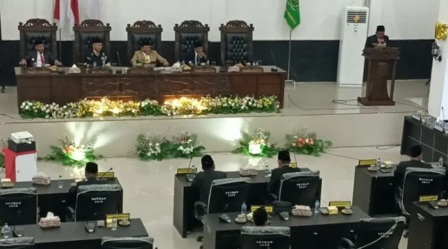 AEKKANOPAN (Waspada): Di hadapan peserta sidang paripurna istimewa hari jadi Kabupaten Labuhanbatu Utara ke-15, Jumat (21/7), Kepala Dinas Pendidikan, Irwan,S.pd, M.pd membacakan sejarah singkat berdirinya kabupaten yang dimekarkan pada 21 Juli 2008 lalu tersebut.