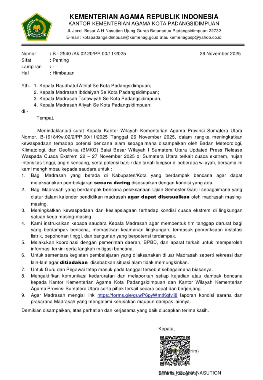 Demikian salah satu poin dalam surat imbauan Kakan Kemenag Padangsidimpuan kepada Kepala Raudhatul Athfal (RA), Kepala Madrasah Ibtidaiyah (MTs) dan Kepala Madrasah Aliyah (MA) se-Kota Padangsidimpuan tertanggal 26 November 2025.