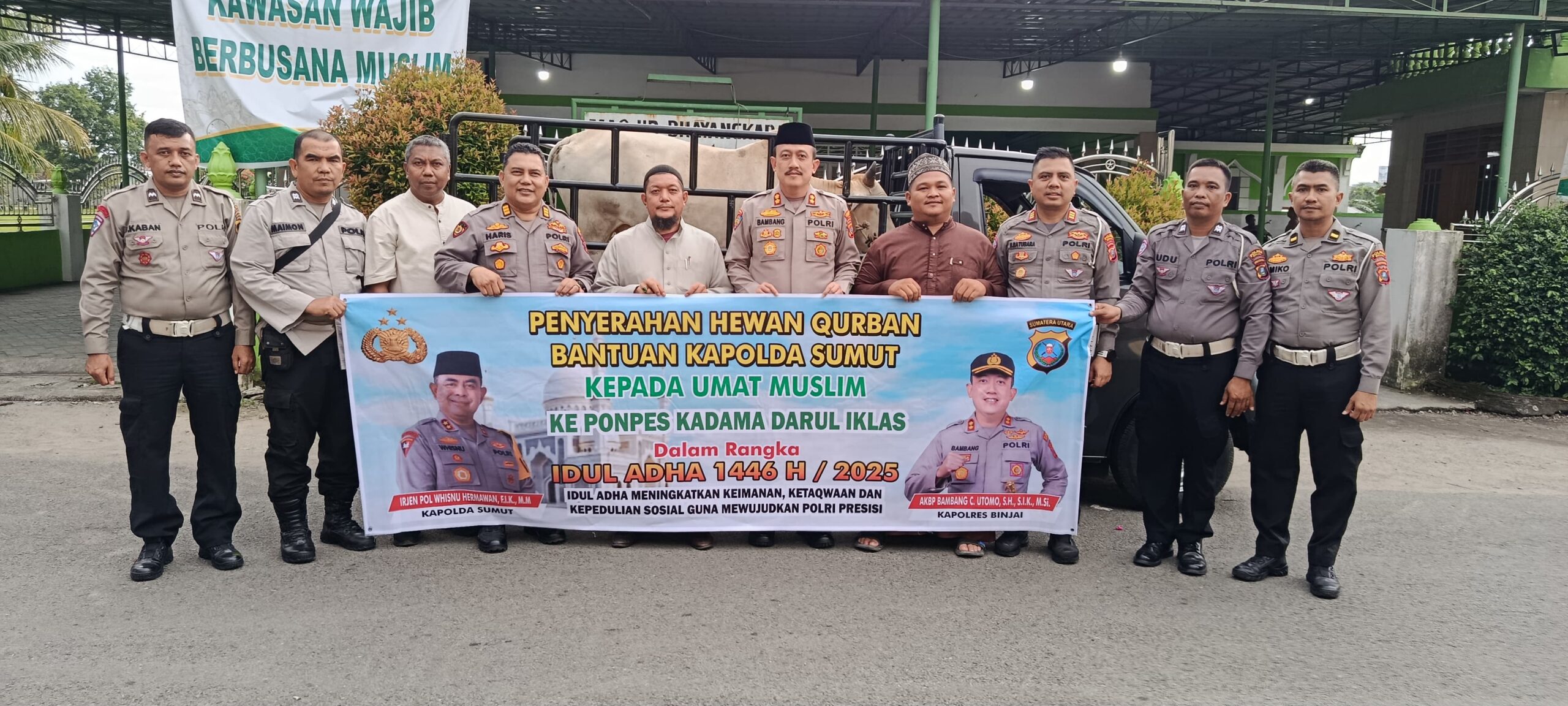 BINJAI (Waspada): Kapolda Sumut Irjen Pol. Drs. RZ. Panca Putra Simanjuntak, M.Si., menyerahkan hewan kurban berupa satu ekor sapi kepada Pondok Tahfidz Kadama Darul Ikhlas, Jalan Dr. Wahidin Gang Pacet, Kecamatan Binjai Timur, Kamis (5/6).