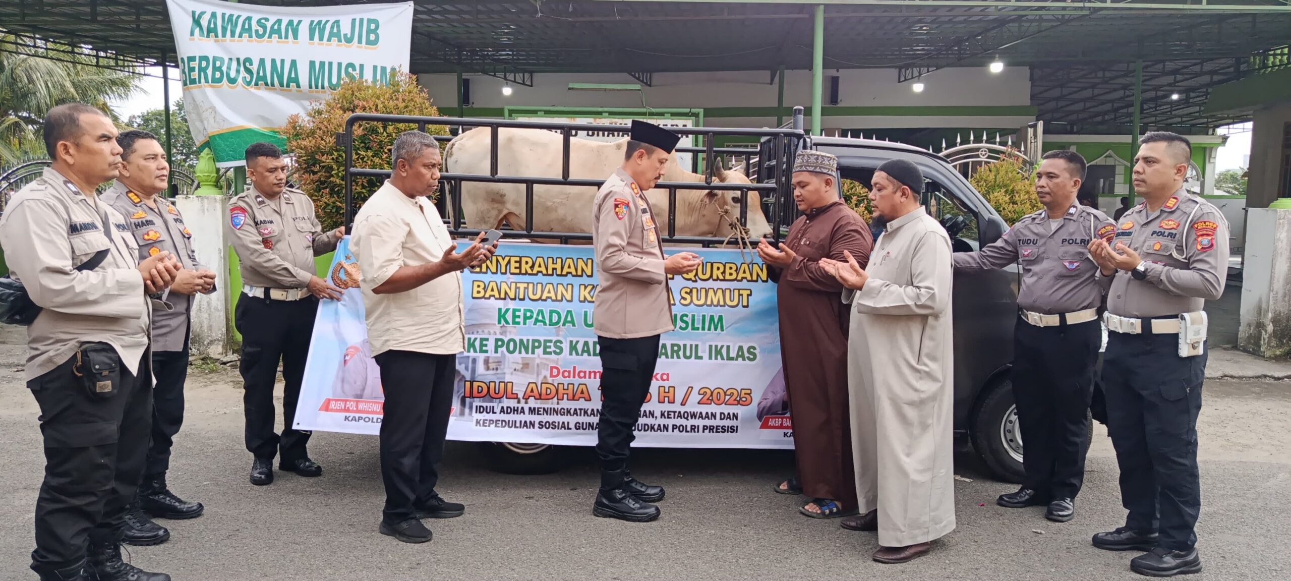 Penyerahan dilakukan secara simbolis oleh Kapolres Binjai AKBP Bambang C. Utomo kepada pengurus ponpes, Ust. Bani Pujiono, di depan Masjid Polres Binjai Al Ikhlas.