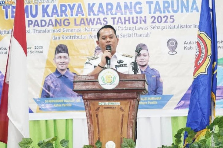 SIBUHUAN (Waspada.id): Bupati Padanglawas, Putra Mahkota Alam Hasibuan SE, membuka Temu Karya Karang Taruna dengan tema “Digitalisasi Aksi, Tranformasi Generasi: Karang Taruna Padanglawas Katalisator Inovasi dan Kontributor Pembangunan Sosial Daerah” di Aula Hotel Syamsiah Sibuhuan, Rabu (15/10/2025). Acara ini sekaligus melantik Muhammad Edi Rizki Tasosa sebagai Ketua Karang Taruna periode 2025-2030.
