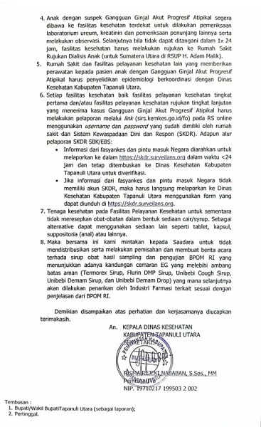 Sudirman Manurung mengatakan untuk mengantisipasi kasus ganguan ginjal akut pada anak tidak terjadi di Kabupaten Tapanuli Utara, serta menindaklanjuti Surat Direktorat Jenderal Pelayanan Kesehatan Kementerian Kesehatan RI Nomor: SR. 01.05/III/ 3461/2022 tanggal 18 Oktober 2022 tentang Kewajiban Penyelidikan Epidemologi dan pelaporan Kasus Gangguan Ginjal Akut Atipikal Pada Anak dan Surat Gubernur Sumatera Utara Nomor: 440/124739/2022 tanggal 19 Oktober 2022 tentang Himbauan Kewaspadaan Gangguan Ginjal Akut Progresif Atipikal Pada Anak, Dinas Kesehatan Taput, pihaknya sudah menerbitkan surat himbauan kepada semua pimpinan rumah sakit, puskesmas, serta pimpinan apotek dan toko obat yang ada di Kabupaten Tapanuli Utara.