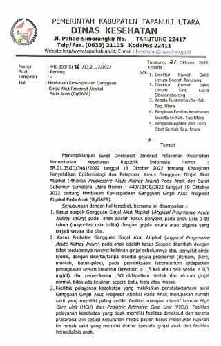 TARUTUNG (Waspada) : Dinas Kesehatan Kabupaten Tapanuli Utara (Dinkes Taput) mengatakan hingga saat saat ini kasus Gangguan Ginjal Akut Progesif Atipikal pada Anak (GgGAPA) belum ada di wilayahnya karena belum ada laporan atau informasi dari semua puskesmas yang ada di Kabupaten Taput dan Rumah Sakit Umum Tarutung mengenai kasus tersebut.