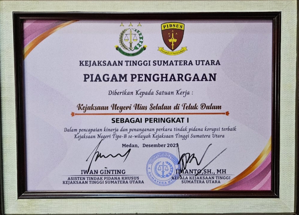 TELUKDALAM, Nisel (Waspada): Kejaksaan Negeri (Kejari) Nias Selatan meraih penghargaan Peringkat I (terbaik) Kejaksaan Negeri Type B dalam Pencapaian Kinerja Penanganan Tindak Pidana Korupsi (Tipikor) tahun 2023 se Wilayah Kejaksaan Tinggi Sumatera Utara.