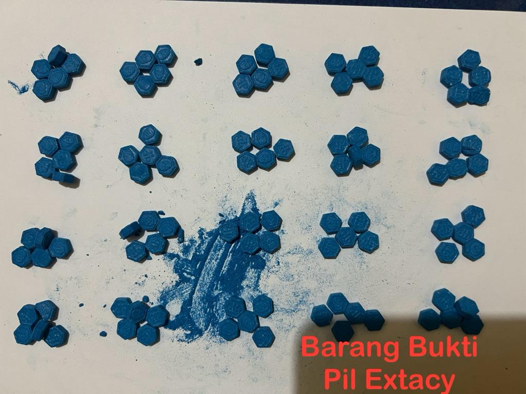Dari mereka petugas menyita 100 butir pil berwarna biru merk QP diduga narkotika jenis ekstasi dengan berat bruto 33,53 gram, 1 HP dan 1 mobil Toyota Agya BK 1652 VR dari tersangka ARS.