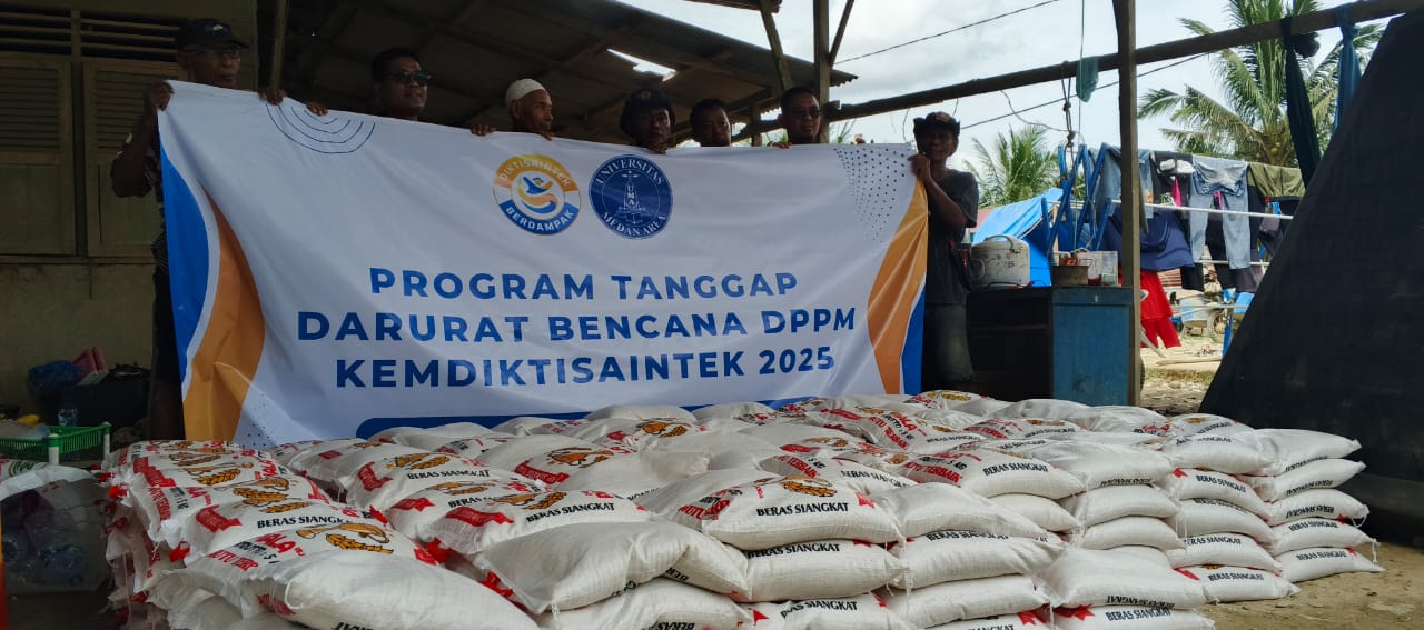 BESITANG (Waspada.id): Universitas Medan Area (UMA) distribusikan bantuan Program Tanggap Darurat Bencana DPPM Kementerian Pendidikan Tinggi, Sains, dan Teknologi (Kemdiktisaintek) 2025 kepada warga korban banjir di Desa Sekoci, Kec. Besitang, Selasa (30/12).