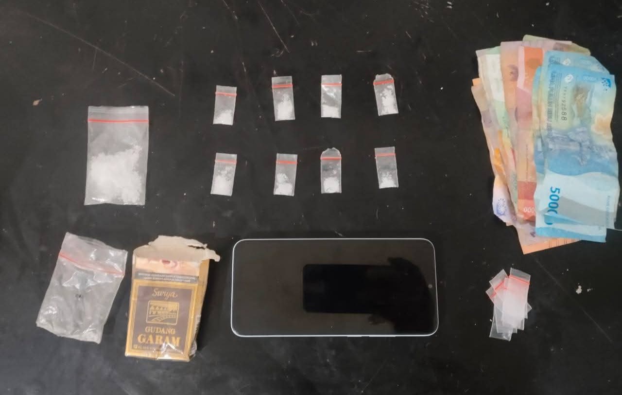 Dari penggeledahan, polisi menyita total sabu brutto 4,18 gram beserta kemasan, uang tunai Rp410 ribu, handphone, dan kotak rokok yang dijadikan tempat penyimpanan. Tersangka mengaku mendapatkan pasokan dari seseorang berinisial R yang saat ini masih dalam pengejaran.