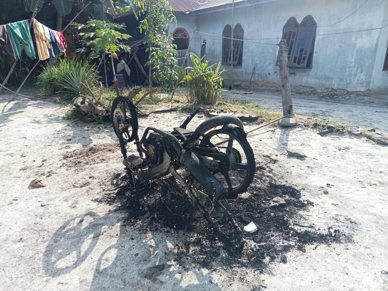 TELUKMENGKUDU (Waspada): Sepeda motor Yamaha Vixion BK 2602 SK milik terduga pelaku begal hangus dibakar warga di Dusun IV, Desa Pematangguntung, Kecamatan Telukmengkudu, Sedangbedagai (Sergai) Kamis (10/4) sekitar pukul 00:25 WIB.