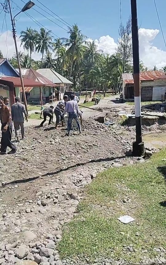 Sisa material banjir berupa lumpur tebal, pasir, dan tumpukan kayu masih mengurung permukiman warga. Drainase belum berfungsi normal, akses jalan lingkungan rusak, dan sejumlah rumah warga dilaporkan mengalami kerusakan berat.