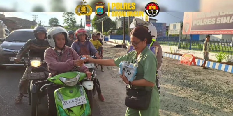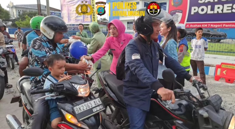 SIMALUNGUN (Waspada.id): Bhayangkari Cabang Simalungun bersama Istri Forkopimda Kabupaten Simalungun serta perwakilan Bank BRI Cabang Pematangsiantar terlihat kompak membagikan takjil kepada para pengendara di ruas Jalan Asahan KM VII, tepat di depan Kantor Sat Lantas Polres Simalungun, Kecamatan Siantar, pada Jumat sore (27/02/2026) mulai pukul 17.10 WIB. Suasana hangat dan penuh kebersamaan menarik perhatian serta mengundang rasa syukur dari penerima.