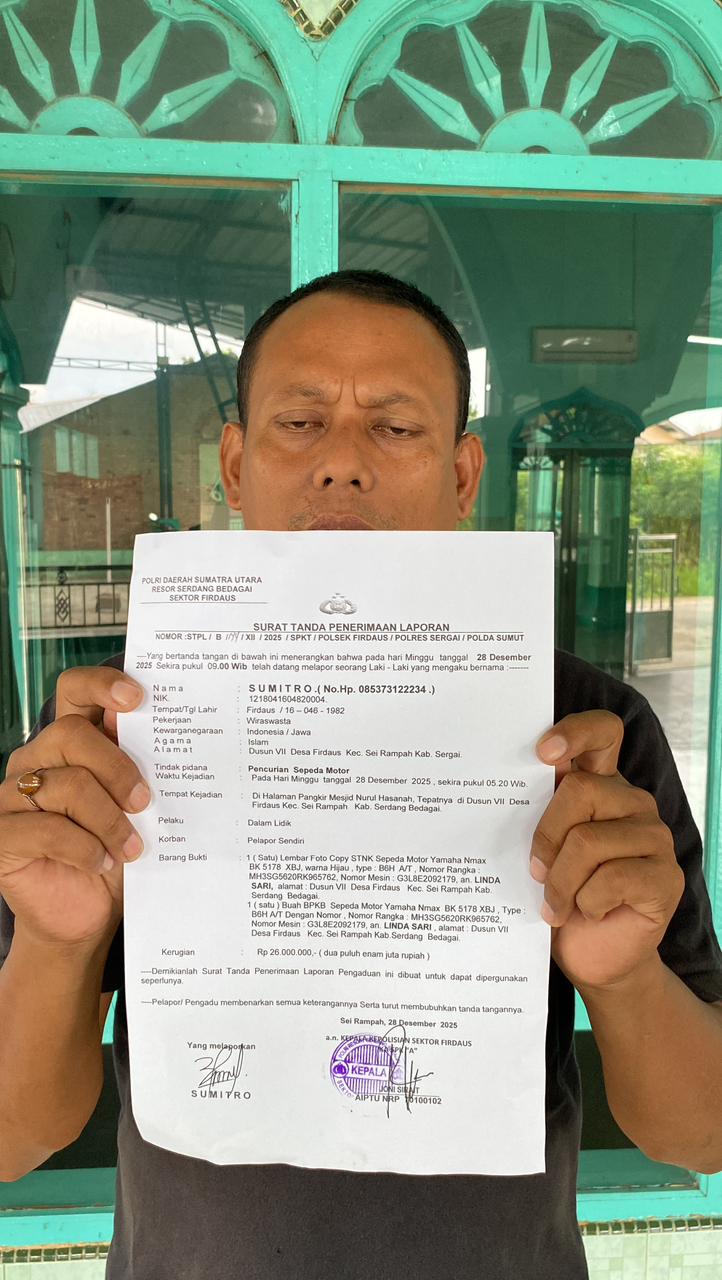 SERGAI (Waspada.id): Aksi pencurian sepeda motor Yamaha NMax BK 5178 XBJ terjadi di halaman parkir Masjid Nurul Hasanah, Dusun VII Lorong VII, Desa Firdaus, Kecamatan Sei Rampah, Kabupaten Serdangbedagai (Sergai), Minggu (28/12/2025) Subuh.