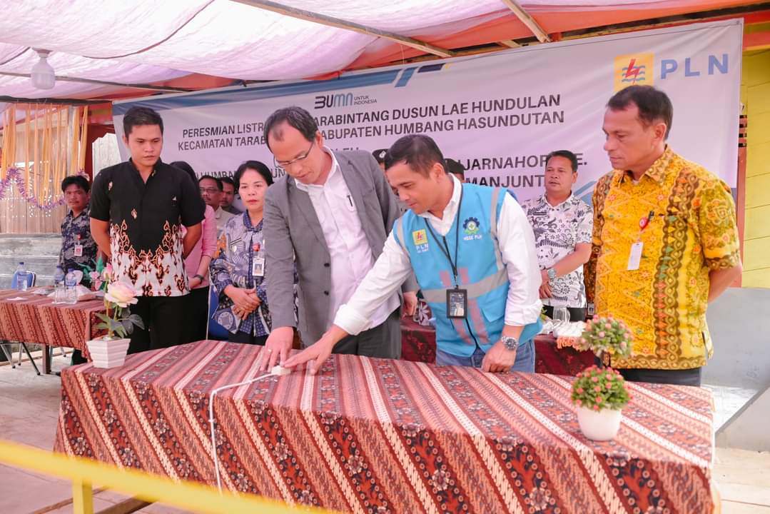 DOLOKSANGGUL (Waspada): Dusun Lae Hundulan, Desa Tarabintang, Kecamatan Tarabintang, Kabupaten Humbang Hasundutan secara resmi dialiri listrik, Kamis (16/2). Peresmian listrik masuk dusun itu dilakukan oleh Bupati Humbahas Dosmar Banjarnahor melalui pengguntingan pita oleh dan penekanan tombol.
