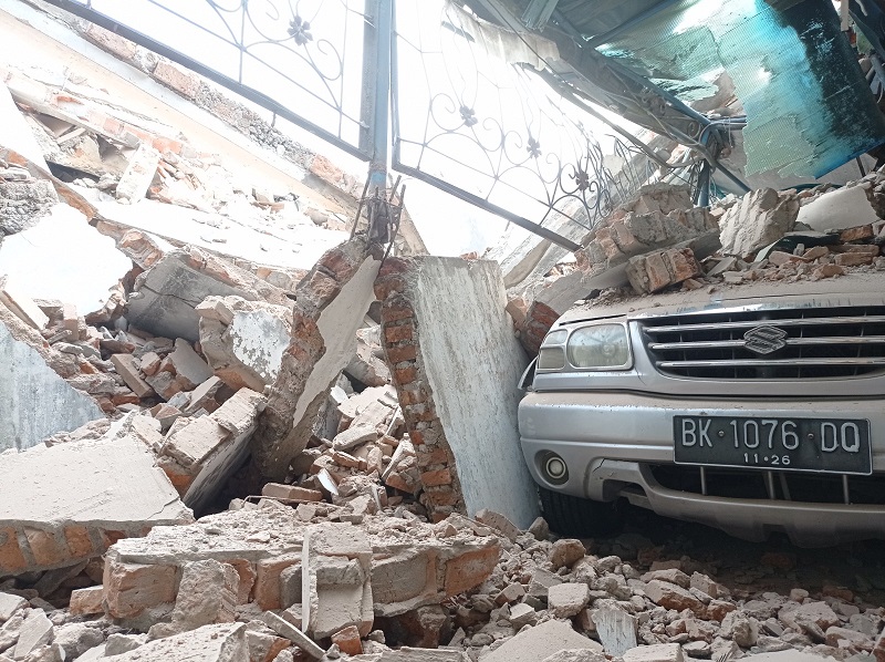 Selain rumah, mobil Suzuki Escudo BK 1076 DQ miliks Susanti yang parkir persis di samping rumahnya ikut hancur tertimpa puing bangunan ruko tersebut.