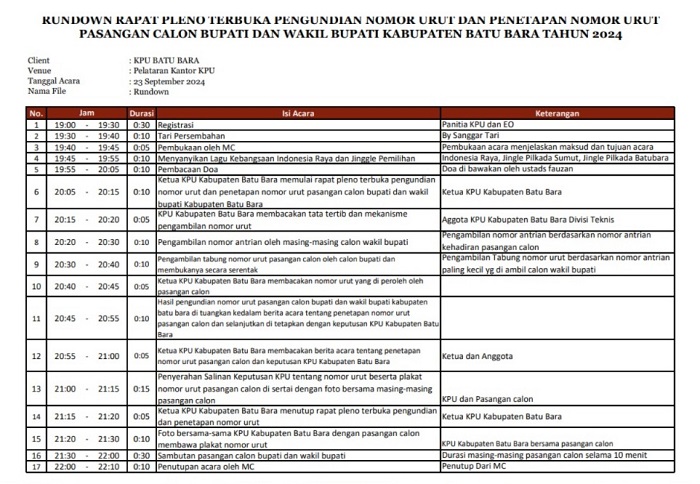 Dalam klien KPU Batubara dijelaskan, rangkaian kegiatan rapat pleno terbuka, pukul 19.00-19.30 WIB registrasi Panitia KPU dan EO, tari persembahan, pembukaan oleh MC terkait maksud dan tujuan acara.