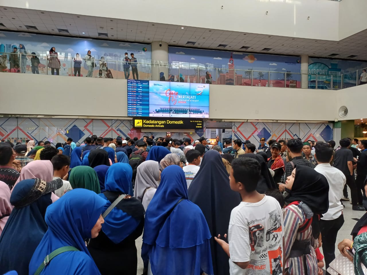 Terlihat massa dari pengusung partai yakni PKB, NasDem dan PKS serta relawan dari masyarakat menunggu kedatangan Capres Anies di kedatangan domestik hingga keluar pintu KNIA.