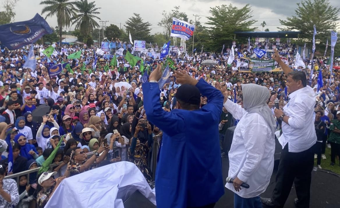 DELISERDANG (Waspada): Pasangan Calon (Paslon) Bupati dan Wakil Bupati Deliserdang putra asli daerah, Drs HM Ali Yusuf Siregar MAP dan Bayu Sumantri Agung (Yusuf-Bayu) menggelar kampanye akbar di lapangan sepakbola Sei Semayang, Kecamatan Sunggal, Kabupaten Deliserdang, Minggu (17/11).