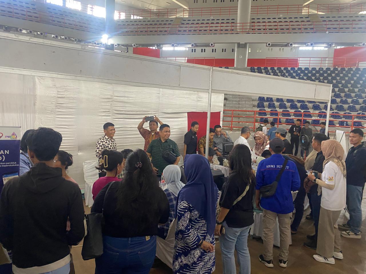 DELISERDANG (Waspada): Stand pengurusan Administrasi Kependudukan (Adminduk) Dinas Kependudukan dan Pencatatan Sipil (Disdukcapil) Deliserdang, diserbu saat peringatan Hari Buruh Internasional atau May Day tingkat Provinsi di Gedung Serbaguna, Desa Medan Estate, Kabupaten Deliserdang, Kamis (1/4).