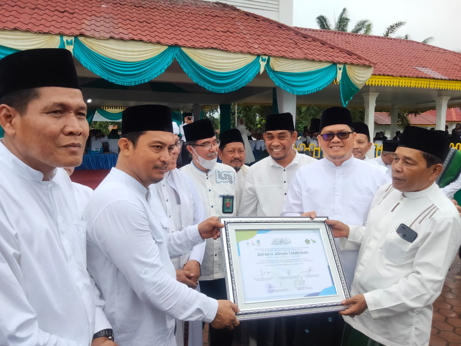 Foto: KAKAN Kemenag Deliserdang Drs.H.Abdul Haris Harahap, MAP, menyerahkan Piagam Penghargaan dari Badan Silaturahmi Pesantren Sumatera Utara (BSPSU) kepada Bupati Deliserdang H.Ashari Tambunan yang diterima Asisten Pemerintahan dan Kesra Setdakab Deliserdang Citra Effendi Capah didampingi Kabag Kesra Setdakab Deliserdang Syahrul pada Peringatan Hari Santri Nasional Tahun 2022 di Alun-alun Pemkab Deliserdang, Sabtu (22/10) pagi.- (Waspada/Khairul K Siregar/B)