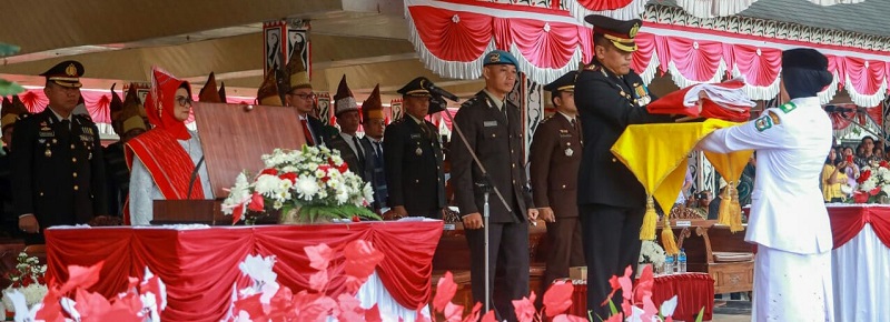 Peringatan detik-detik proklamasi kemerdekaan RI dengan tema “Terus Melaju Untuk Indonesia Maju,” berawal dengan sirene, pembacaan naskah teks proklamasi dari Ketua DPRD Timbul Marganda Lingga, mengheningkan cipta, doa dan pengibaran Bendera Merah Putih.