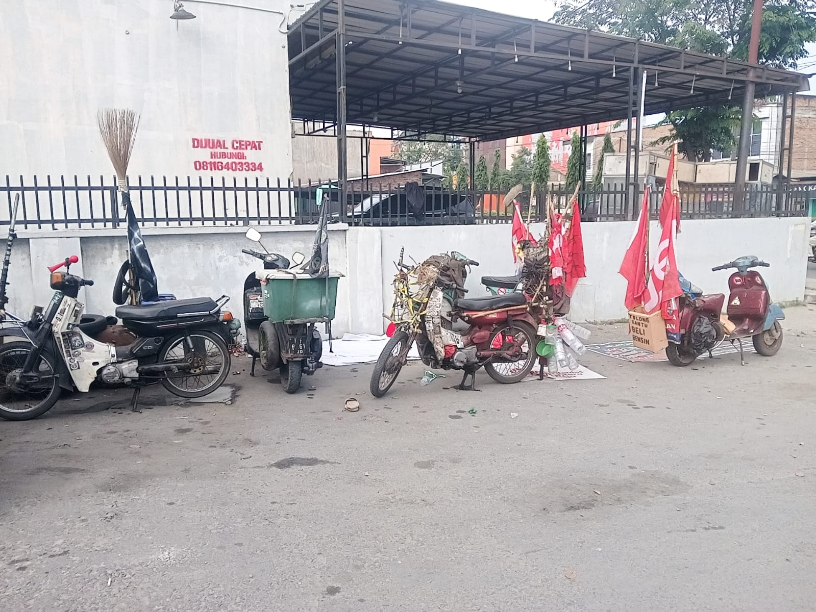 “Kami dalam perjalanan bertemu dan berbincang, kemudian bergabung. Untuk makan dan minyak, kami meminta belas kasih orang. Kalau tidur di pom bensin, tapi kendaraan tetap kami dijaga karena takut hilang dan dirusak orang. Jika kereta unit rusak ya diperbaiki sendiri, karena kami juga bawa peralatan. Kecuali sparepart harus baru, terpaksa dibeli,” papar Cacat.