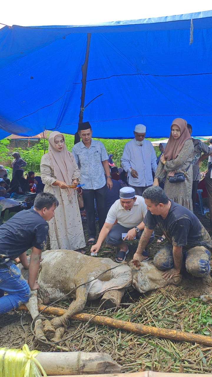 PADANGLAWAS (Waspada): Momen Idul Adha 1445 Hijriyah/2024, Putra Mahkota Alam Hasibuan, SE, Ketua BPC Himpunan Pengusaha Muda Indonesia (HIPMI) Padanglawas (Palas) mempersembahkan kurban berupa seekor lembu, Senin (17/6).