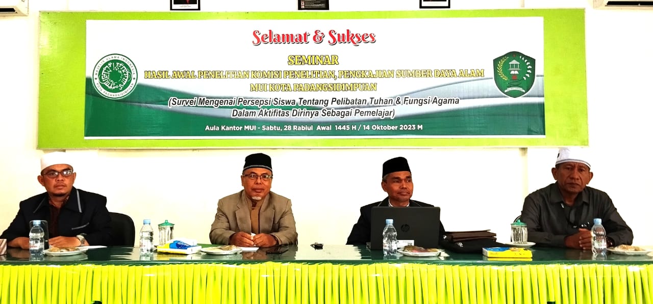 Seminar hasil penelitian mengenai persepsi siswa tentang pelibatan Tuhan dan fungsi agama dalam aktivitas dirinya sebagai pemelajar yang digelar di Aula Kantor MUI, Jl.HT.Rizal Nudin, Palampat, Padangsidimpuan dibuka Ketua Umum DP MUI Padangsidimpuan Ustadz Drs.H.Zulfan Efendi Hasibuan MA.
