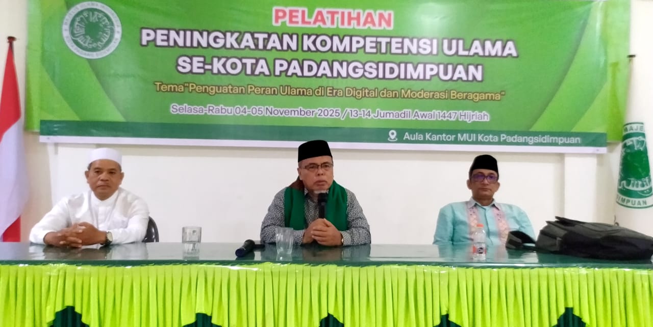 Pelatihan Peningkatan Kompetensi Ulama Tahun 2025 se Kota Padangsidimpuan yang digelar selama dua hari (4 sampai 5 November 2025) menghadirkan 4 pembicara yakni Dr.H.Zul Anwar Ajim Harahap MA, Drs.H.Zulfan Efendi Hasibuan MA, H.Yasir Arafat Nasution LC, MA dan Dr.Zulfadli Nasution M.Pd.
