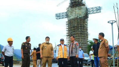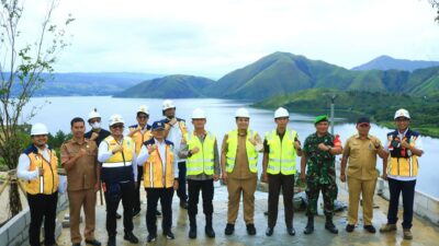 Kepala Balai Prasarana Permukiman Wilayah (BPPW) Sumatera Utara Syafriel Tansier didampingi Bupati Samosir Vandiko T Gultom, dan Forkopimda saat melakukan monitoring pelaksanaan kegiatan pembangunan di lokasi objek wisata Sibea-bea. (Waspada/Tumpal P Sijabat)