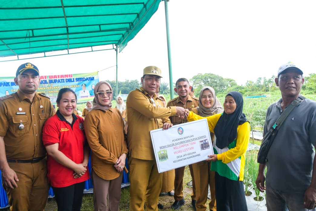 “Cabai merupakan salah satu komoditas strategis yang sangat memengaruhi inflasi di Kabupaten Deliserdang. Harga cabai yang fluktuatif, mulai dari Rp15 ribu hingga Rp80 ribu per kilogram, karena itu perlu dicarikan solusi agar petani tetap sejahtera,” kata Wakil Bupati (Wabup) Deliserdang, Lom Lom Suwondo SS yang hadir bersama Ketua I Bidang Pembinaan Karakter Keluarga, Ny Asniar Lom Lom Suwondo, pada panen perdana cabai merah bersama Kelompok Tani (Poktan) Bersama di Desa Deli Tua, Kecamatan Namorambe, Selasa (30/12/25).