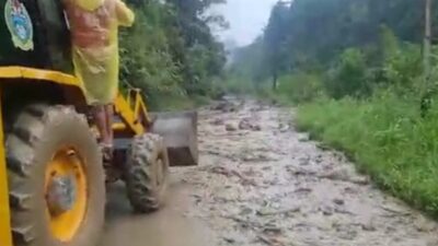 Jalur Panyabungan-Muarasoma, Kec. Batangnatal, Kab. Mandailing, berjibaku membersihkan tumpukan longsor. Sekarang, sudah bisa dilewati dengan sistem buka-tutup.