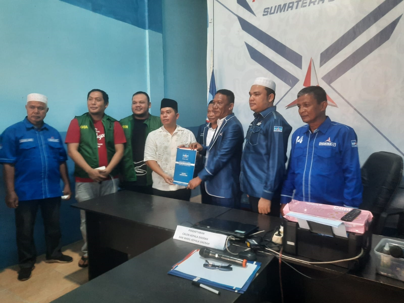PADANGLAWAS (Waspada) : DPC Partai Demokrat Kabupaten Padanglawas menerima berkas pendaftaran Putra Mahkota Alam Hasibuan, SE sebagai bakal calon Bupati Padanglawas periode 2025-2030, Kamis (4/4).