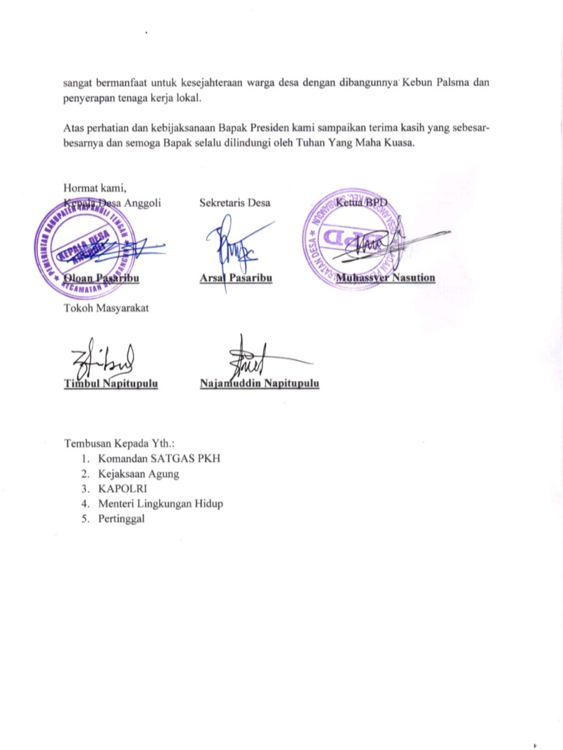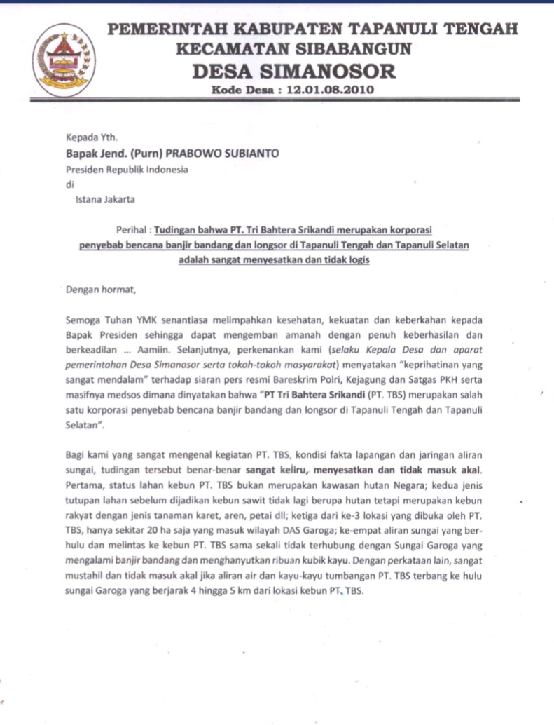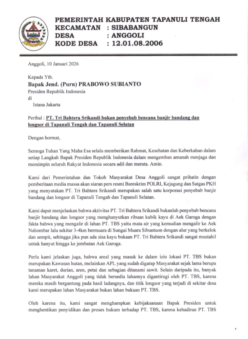 TAPANULI TENGAH (Waspada.id): Pemerintah Desa Anggoli dan Desa Simanosor, Kecamatan Sibabangun, Kabupaten Tapanuli Tengah, menyurati Presiden Republik Indonesia Prabowo Subianto untuk menghentikan proses hukum terhadap PT Tri Bahtera Srikandi (TBS) yang dituding sebagai penyebab banjir dan longsor di Tapanuli Selatan (Tapsel) dan Tapanuli Tengah (Tapteng).