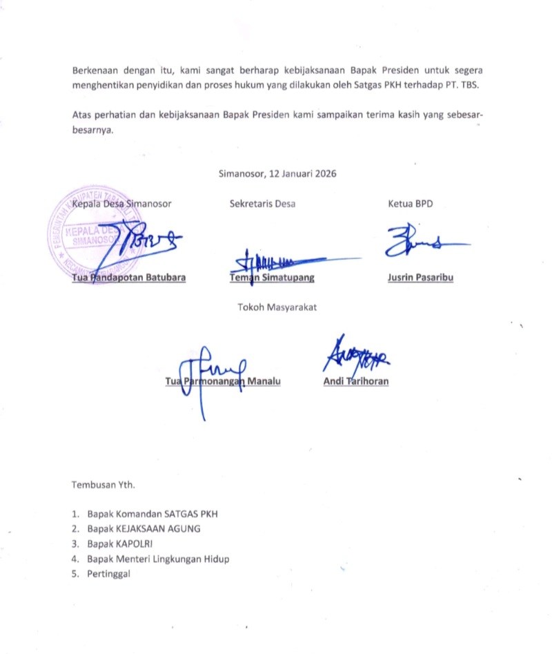 Kepala Desa Simanosor Tua Pandapotan Batubara dalam suratnya juga menyampaikan hal serupa. Ia menyatakan, status lahan PT TBS bukan kawasan hutan negara dan aliran sungainya tidak terhubung dengan Sungai Garoga yang berjarak 4–5 kilometer. “Tudingan itu sangat keliru, menyesatkan, dan tidak masuk akal,” jelasnya.