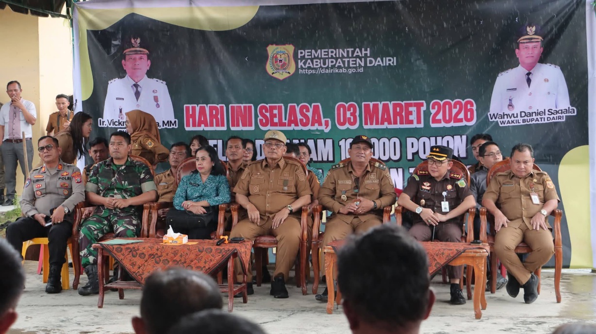 SITINJO (Waspada.id): Pemkab Dairi telah menanam sebanyak 101.000 pohon selama 8 bulan terakhir dalam rangka program penanaman satu juta pohon yang dicanangkan dalam gerakan merawat bumi. Hal itu disampaikan oleh Bupati Dairi Vickner Sinaga saat deklarasi satu tahun pemerintahan Vickner Sinaga-Wahyu Daniel Sagala yang ditandai dengan pembagian bibit pohon, pada Selasa (3/3/2026) di Lapangan Hotel Beristera, Sitinjo.