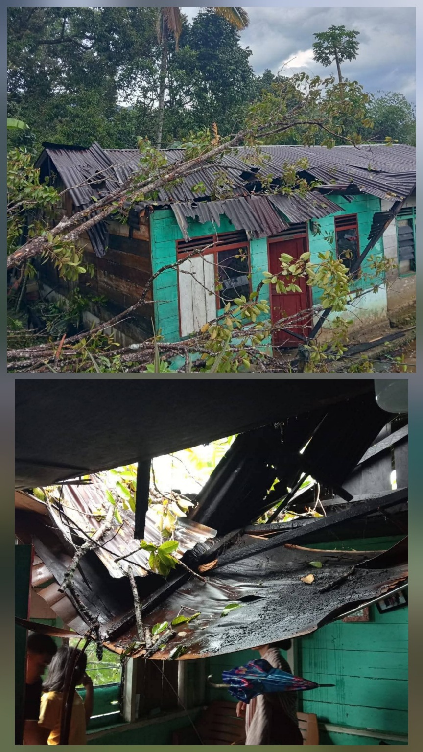 Kejadian pertama terjadi di Desa Siambaton Pahae, Kecamatan Pakkat, Kamis (19/3/2026). Rumah milik Mailam Tumanggor rusak berat.