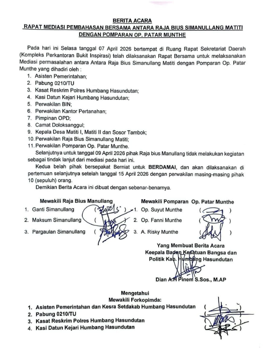 DOLOKSANGGUL (Waspada.id): Pemerintah Kabupaten Humbang Hasundutan memfasilitasi mediasi penyelesaian masalah antara Raja Bius Manullang Matiti dan Pomparan Op. Patar Munthe Sarsiantar di Ruang Rapat Setda, Selasa (7/4/2026).