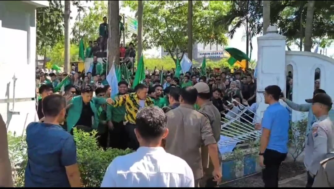 Aksi yang awalnya berlangsung damai tersebut kemudian berubah ricuh. Sejumlah massa aksi yang tepat berada di pintu masuk kantor bupati berubah anarkis. Mereka menggoyang-goyang pintu pagar besi sepanjang 10 meter.