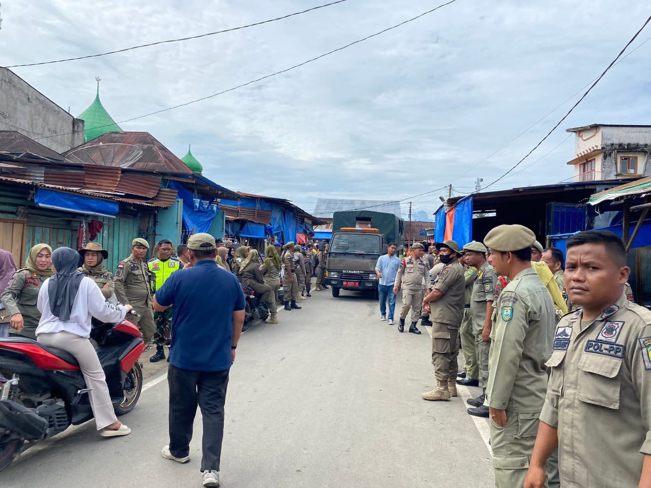 PANYABUNGAN (Waspada.id): Puluhan pedagang, mayoritas wanita, menghadang Tim Satuan Polisi Pamong Praja (Satpol PP) dan Pemadam Kebakaran (Damkar) Mandailing Natal (Madina) di pintu masuk Pasar Kuliling, Kota Panyabungan, Selasa (7/10) pagi.