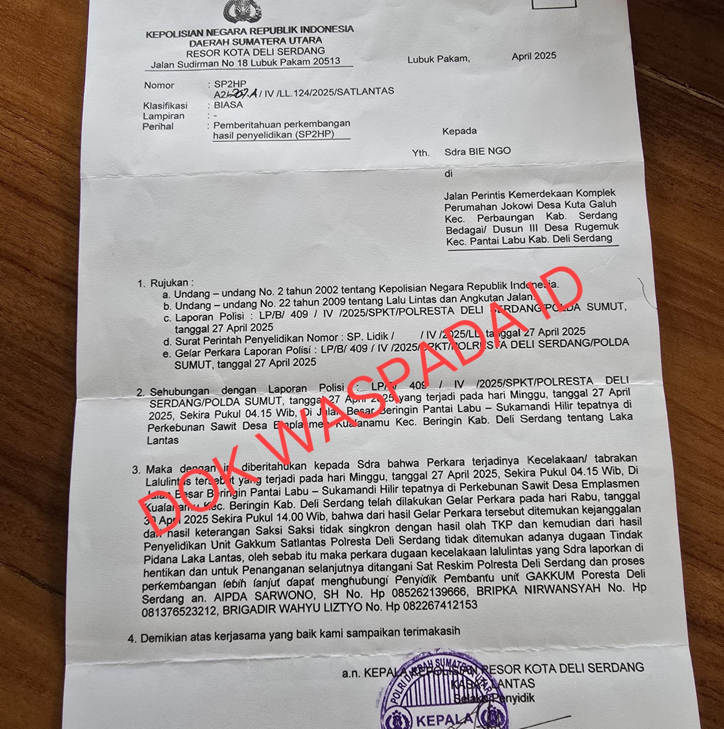Namun, keluarga Ripin tetap bersikukuh bahwa ini kasus dugaan pembunuhan berencana. Apalagi setelah pihak Satlantas Polres Deli Serdang melakukan SP2HP terhadap kasus ini karena keterangan saksi-saksi tidak singkron dengan hasil olah TKP. “Sat Lantas menyerahkan kasus ini untuk ditangani Sat Reskrim Polres Deli Serdang,” tegas Mardi Sijabat sambil menunjukkan dokumen SP2HP nya.