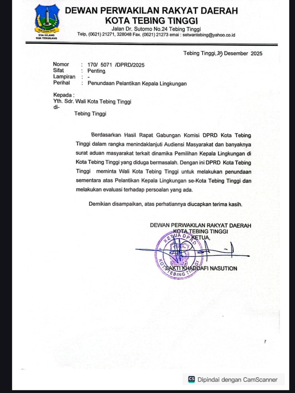 Sehari sebelumnya, DPRD melayangkan surat No. 170/5071/DPRD/2025 Tanggal 29 Desember 2025, perihal Penundaan pelantikan Kepling. Isi surat tersebut meminta agar pelantikan ditunda.