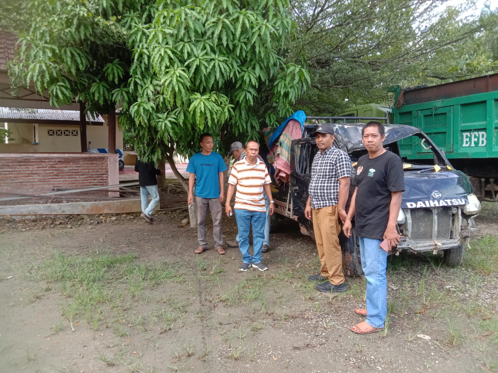 FOTO: Ketua KONI Asahan Harris ST, dan pengurus FAJI Asahan melihat Pick Up yang rusak akibat jatuh ke jurang dan kini sudah diamankan di Polsek Bandar Pulau, Polres Asahan. Waspada/Ist