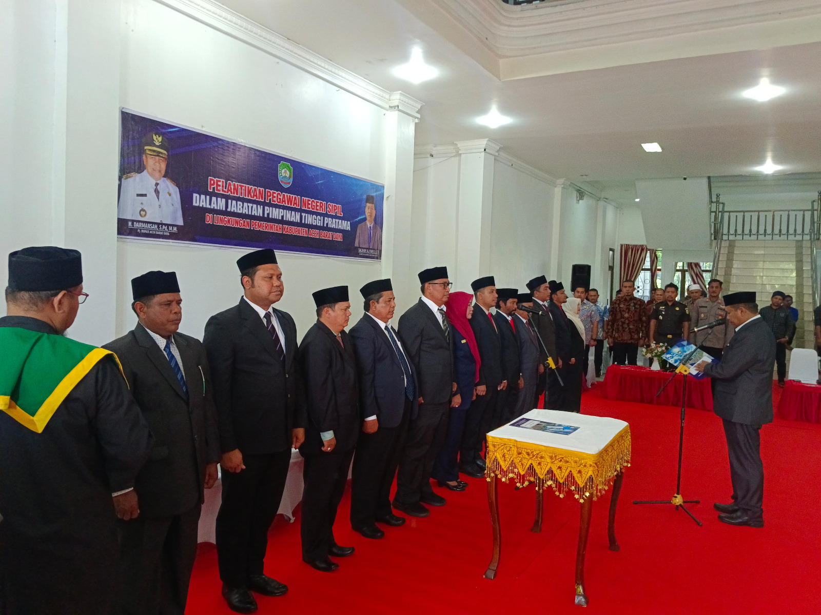 BLANGPIDIE (Waspada): Pj Bupati Aceh Barat Daya (Abdya), Darmansah, Kamis jelang sore (21/3), melantik dan mengambil sumpah terhadap 12 Pejabat Eselon II, dalam lingkungan Pemkab Abdya, di lobi kantor bupati, kompleks perkantoran Bukit Hijau, Blangpidie.