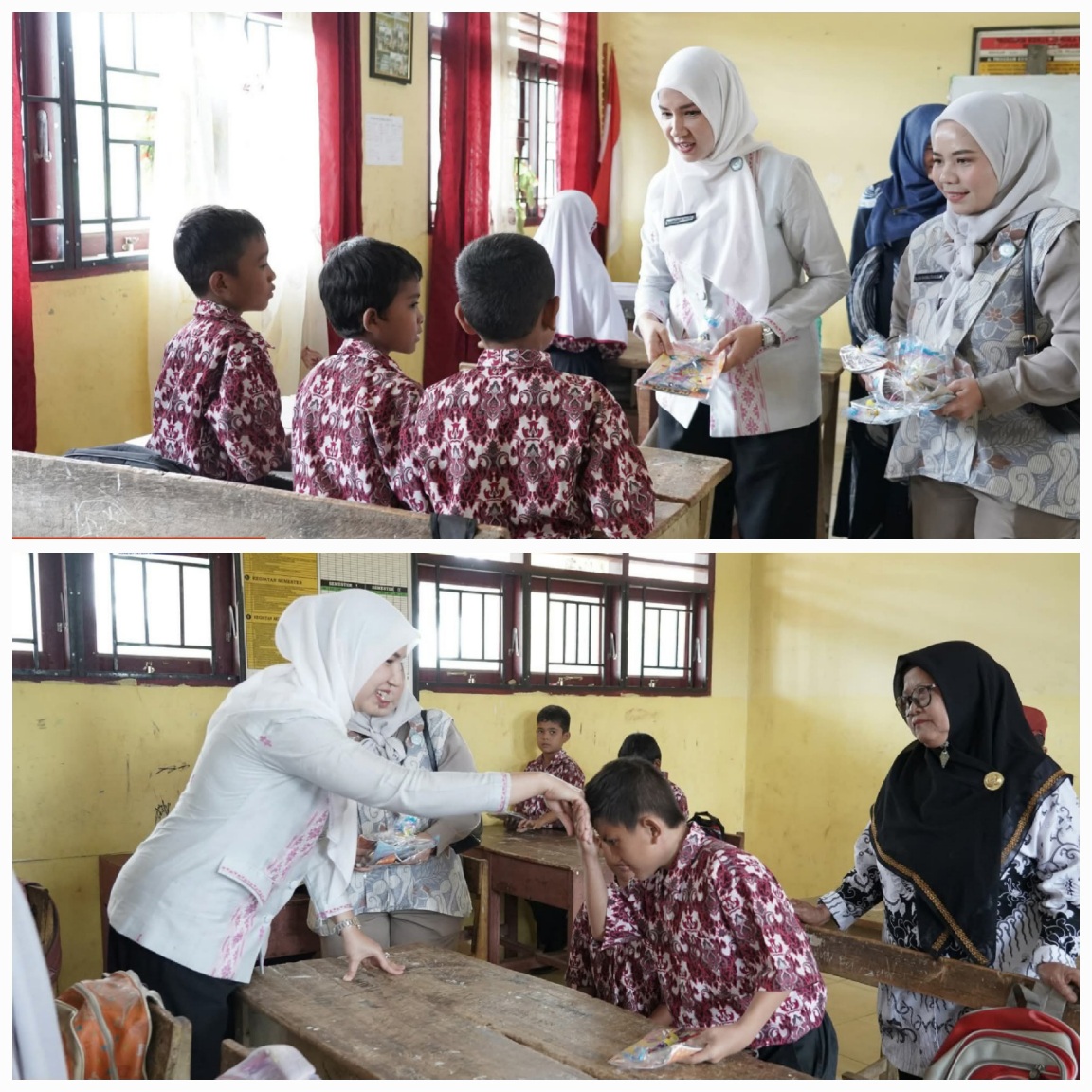 Dalam kunjungannya ke SDN 1402 Hapung, Ny. Mahzalena meninjau suasana belajar murid-murid di kelas sambil mengajak untuk rajin membaca buku di perpustakaan.
