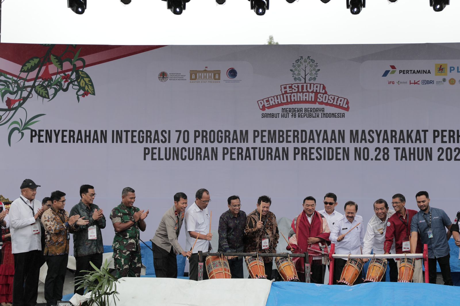 Secara simbolis, 82 program pemberdayaan masyarakat diserahkan dalam acara Festival Perhutanan Sosial, dengan tajuk “Merdeka Berdaya, Sambut HUT 78 Republik Indonesia” di lapangan Simanganrungsang, Kabupaten Humbang Hasundutan, Sumatera Utara, Selasa (1/8).