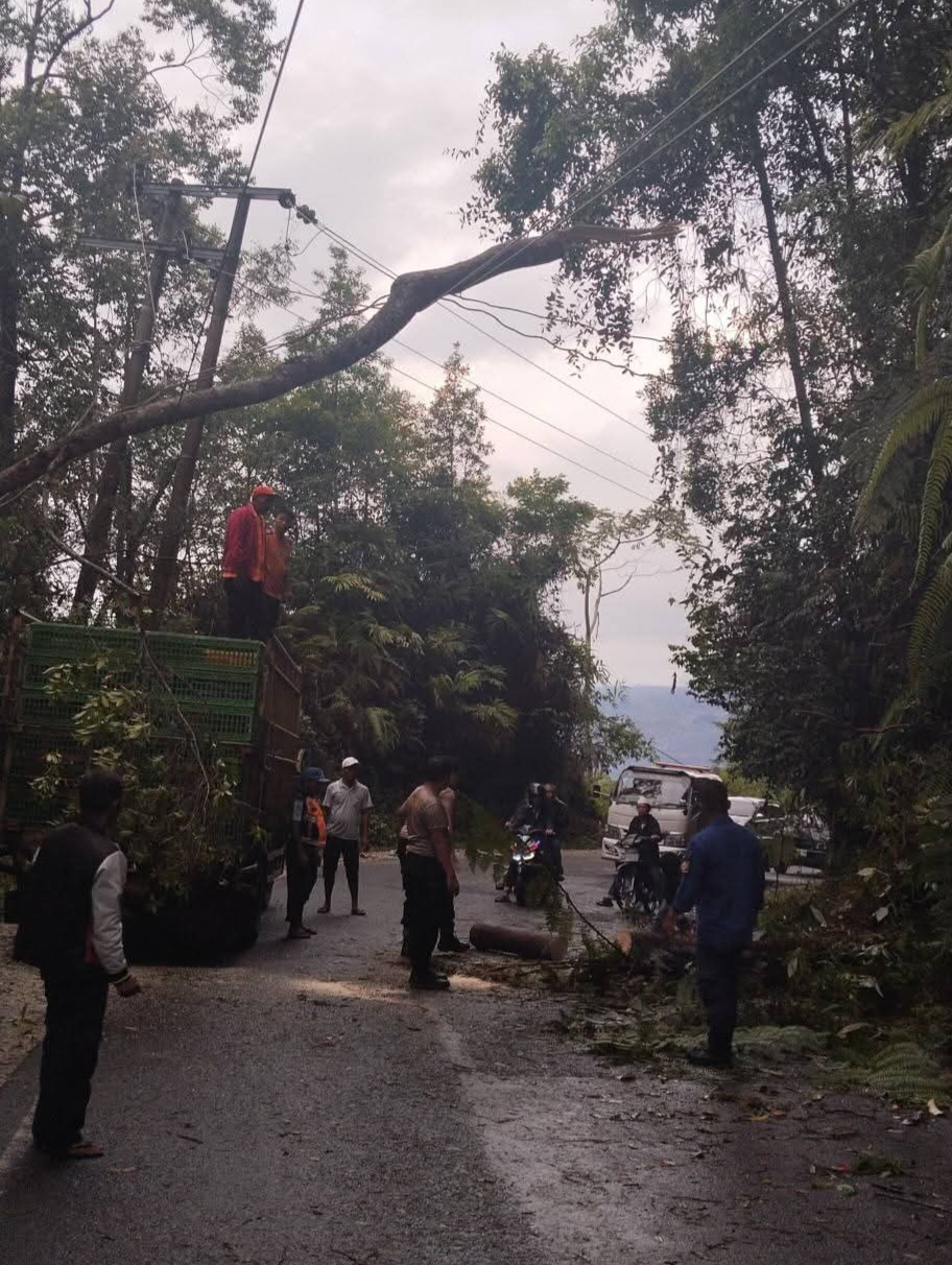KERAJAAN (Waspada.id): Pohon tumbang akibat angin kencang disertai hujan deras, melintang di jalan nasional Sumut-Aceh kawasan Delleng Lumut, Desa Sukaramai, Kecamatan Kerajaan, Pakpak Bharat, Jumat (20/3/2026) sore. Setelah dikerjakan petugas gabungan, akses jalan kini sudah lancar kembali.