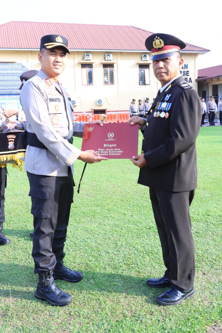 Pada kesempatan tersebut, Kapolres juga membacakan nama-nama personel penerima tanda kehormatan Satyalencana Pengabdian.