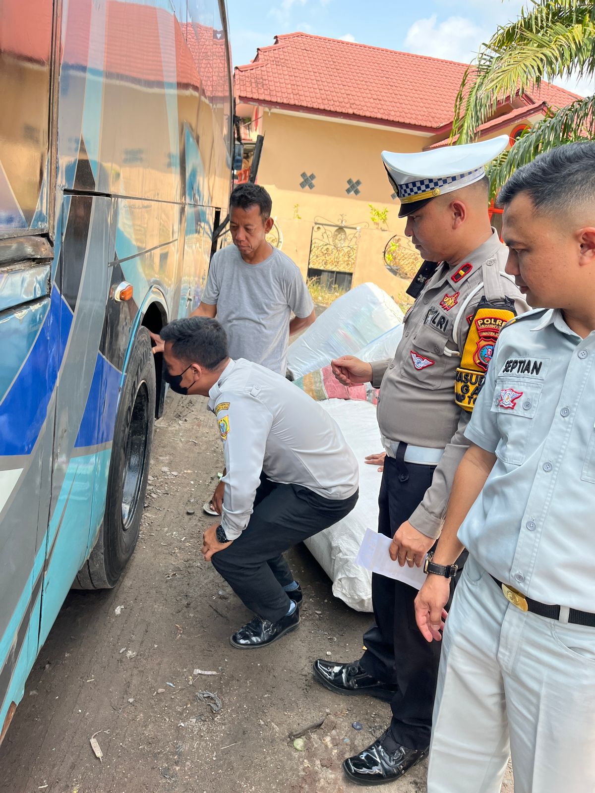 KOTAPINANG (Waspada): Sat Lantas Polres Labusel, Rabu (12/2) siang, melakukan pemeriksaan kendaraan atau Ramcek (Ramp Check) terhadap bus penumpang di Kotapinang, salah satunya PT. Kotapinang Baru di Jalan Labuhan, Kel. Kotapinang.