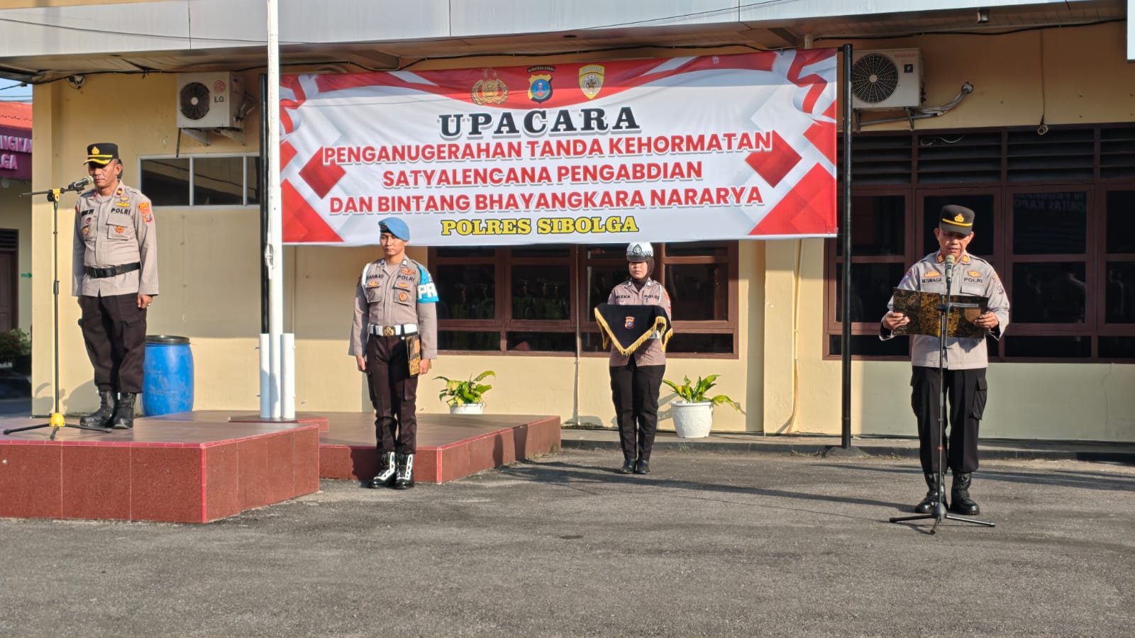 SIBOLGA (Waspada.id): Polres Sibolga melaksanakan Upacara Penganugerahan Tanda Kehormatan Satyalencana Pengabdian dan Bintang Bhayangkara Nararya sebagai bentuk penghargaan negara kepada anggota Polri yang telah menunjukkan dedikasi, loyalitas, serta pengabdian tinggi dalam menjalankan tugas kepolisian.